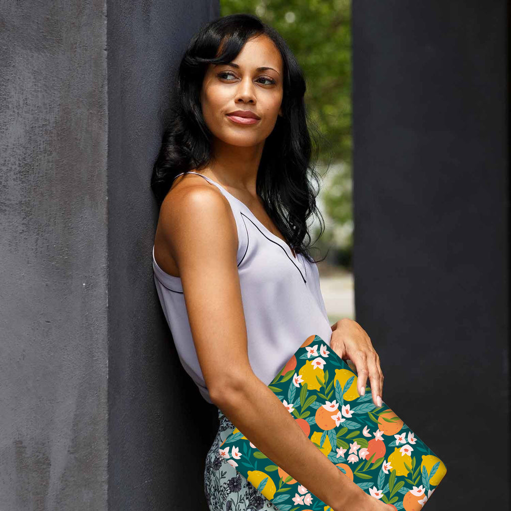 A yong girl holding personalized microsoft surface laptop case with Fruits design