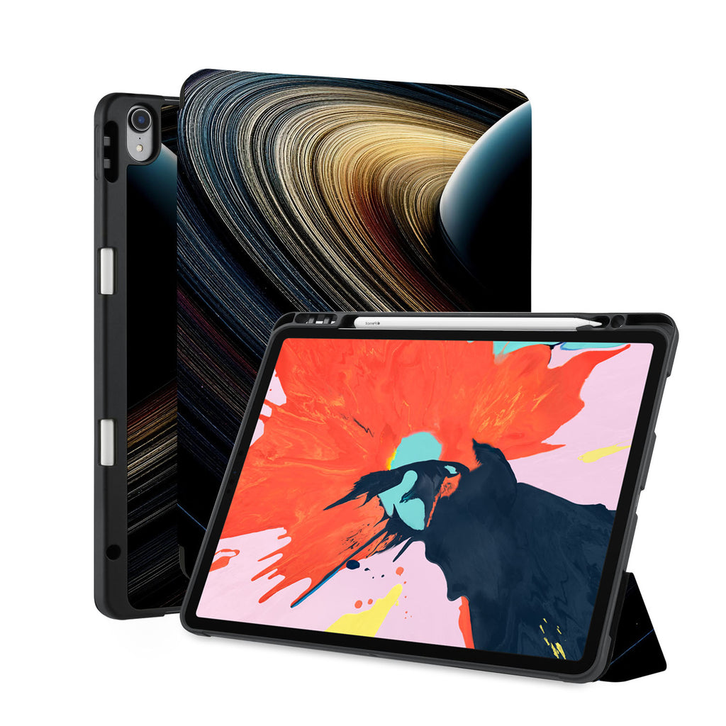 front back and stand view of personalized iPad case with pencil holder and Universe design - swap